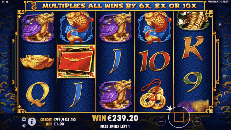 Envelop — you can play the pretty profitable bonus game using this icon. Once you hit 3 Envelopes anywhere, you will see the screen with 5 dragons. 4 come with a fixed number of free spins and a range of multipliers. The 5th one gives you a random number of spins and a random set of multipliers. A multiplier from the chosen range will be applied to the win if the Dragon comprises the winning line in a full view during the bonus game.