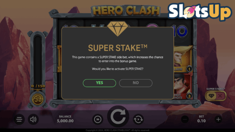 If you play the Hero Clash slot for free, you can estimate the chances of falling out bonuses. They are activated at random. There is an exception - "Super Stake". Players just need to click on the key at the bottom right corner of the screen.