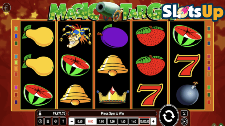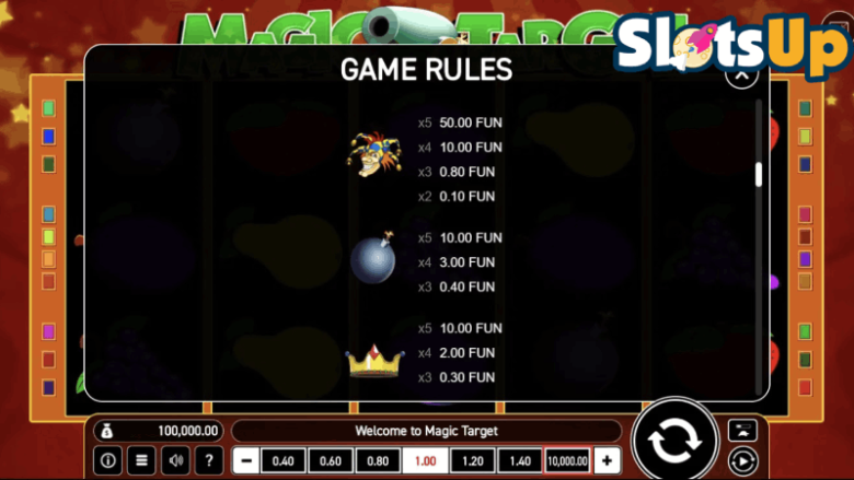 Watermelon, plums, pears, and grapes are low-paying symbols. The symbols that are not fruits include the joker, red 7, golden bell, crown, gun, and cannonball. In the free Magic Target slot machine, the wild symbol is a joker, while the scatter symbol for the free spins is a cannonball. All these symbols come together to offer a unique experience during the gameplay.