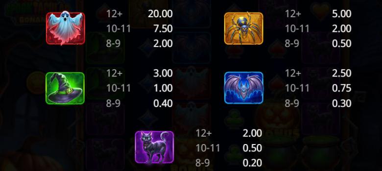 Players can choose between a min. bet of $0.2 and a max. bet of $60. I used the minimum bet size to purchase the bonus round, which cost me $20 (spoiler: it was pretty good). Spooktacular Bonanza symbols are divided into two categories: multi-colored gems are lower-paying symbols, and detailed pictures are correspondingly higher-paying.