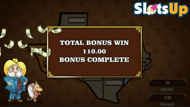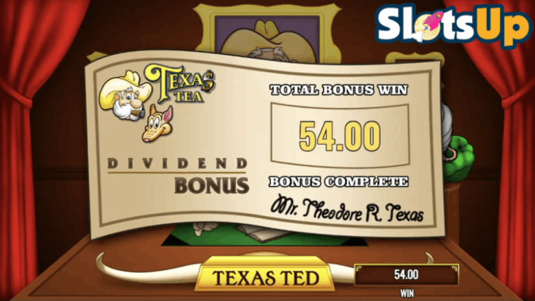Oil Dividend Bonus — this feature is triggered by 3+ Texas Ted symbols (scatter). This symbol has no value, so it is only needed for this mechanic. Its essence is that depending on your bet, you will receive some "dividends" from Ted. The game takes you to his office, and he gives you a check with your dividends (winnings). In simpler words, this is something like a Mega Multiplier, but how much you get is determined by the RNG and the number of Ted symbols (from x3 to x100).