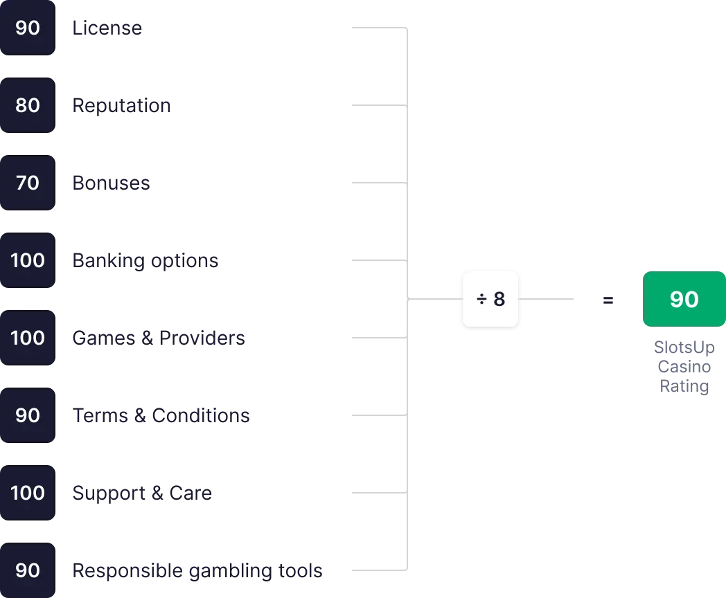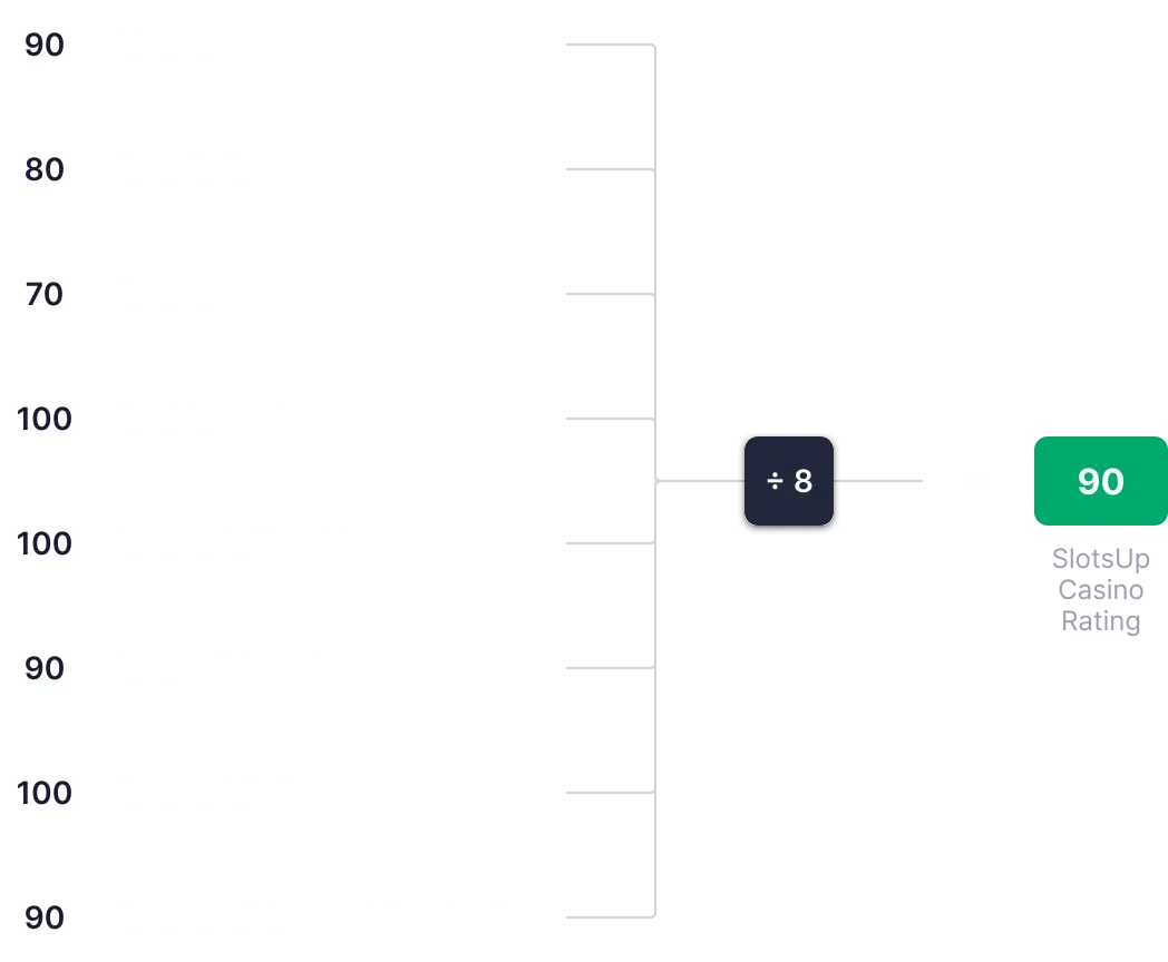 The SlotsUp Casino Rating is calculated based on 8 key metrics, each scored from 0 to 100. These scores are summed, averaged and used to determine the final overall rating.