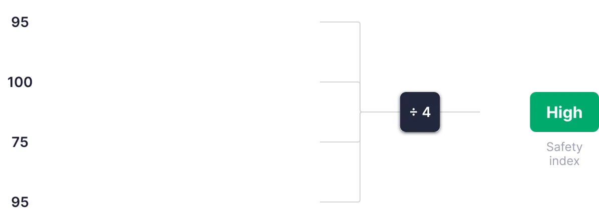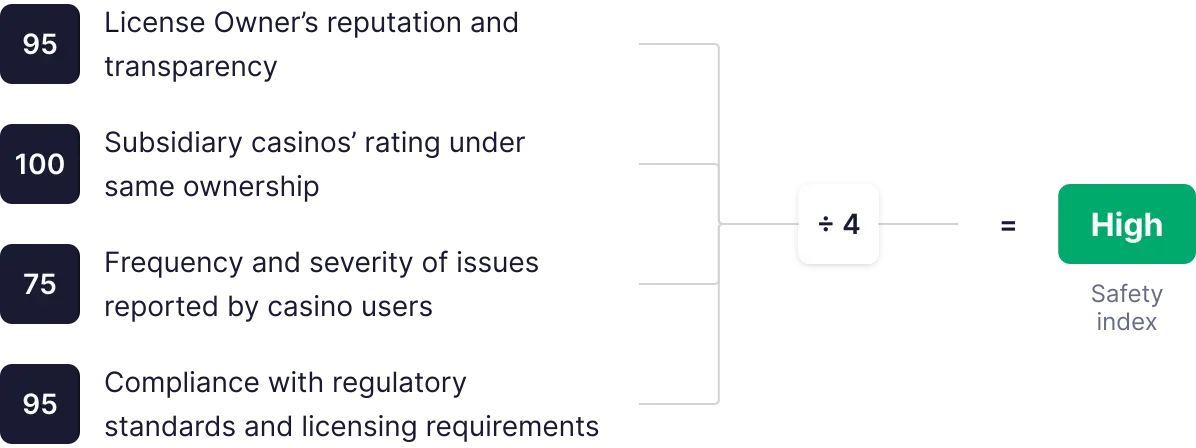 We assess a casino’s safety based on 4 criteria (2 individual and 2 interrelated), each scored from 0 to 100. The scores are then summed, averaged, and used to determine the final safety index.