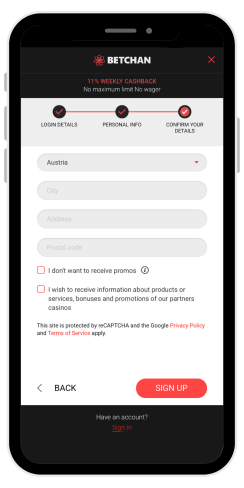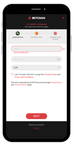 You need to fill in your email (BetChan casino login), password, and choose a currency. You must also tick the box confirming that you are at least 18 years old and that you accept the Privacy Policy and T&C.