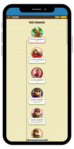 The VIP Program consists of 22 levels, and each level rewards players with free spins or money bonuses. To move up through the levels, players need to collect BPs. One BP is awarded for every €/$30 wagered on slots (other game types do not count). For example, to reach VIP Level 1, a player needs to collect 20 BPs, which means placing €/$600 in slot bets. For reaching this level, the player receives 10 free spins for the “Bob’s Coffee Shop” slot.