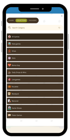 The casino has a convenient game catalog. Bob Casino games can be searched by name, collections, or providers. The available collections include: New Games, Bonus Buy, Roulette, Game Shows, Daily Drops & Wins, Blackjack, Poker Games, Slots, Live Games, and Baccarat. Players can also save games to My Favorites and view previously played titles in Recently Played. I also noticed that themed collections may appear from time to time, for example, Xmas.