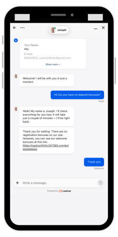 To visit Casino Infinity, you must be at least 18, as required by law in USA and by Casino Infinity terms