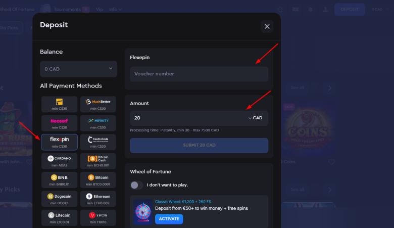 Choose Flexepin from the list of payment options then enter the 16-digit number, and provide a deposit amount within the casino’s limit and your voucher’s value. Some casinos have widgets to receive or decline bonuses upon the deposit.