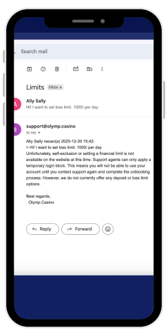 When I was searching information for this Olymp casino review, I found a page dedicated to responsible gaming. There, I came across a self-control test, services designed to block access to the site for minors, and links to organizations that help fight gaming addiction. I also saw that players can contact support to request self-exclusion or set loss limits. I first contacted Live Chat, and the operator told me to reach out to support via email. I wrote to the support email and found out that at the moment neither loss limits nor even the self-exclusion option is available. I believe the casino should update this information and remove these options from the list so as not to mislead players.