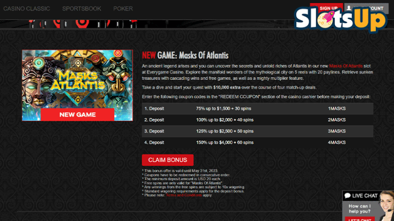 Bonuses at Everygame are available even for small deposits like $20. You can receive the first casino reward after signing up. Generally, customers can get 125% matches up to $5555 for three replenishments. The platform offers progressive jackpots of three kinds: Aztec’s Millions, Megasaur, and Pinatas, ranging from $800,000 to $1.5 million.