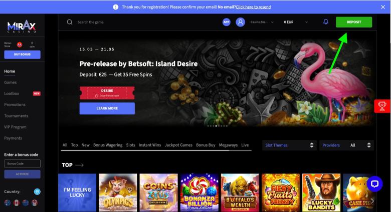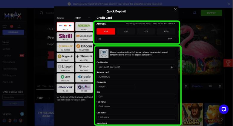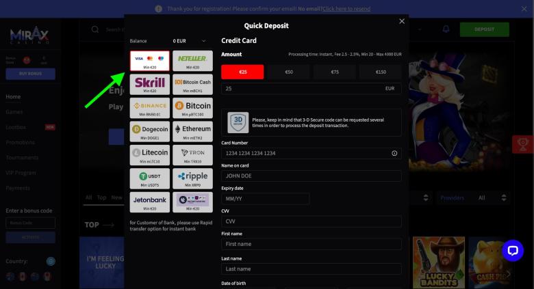 Use your new username and password to log in to Mirax Casino.Go to the Deposit Section